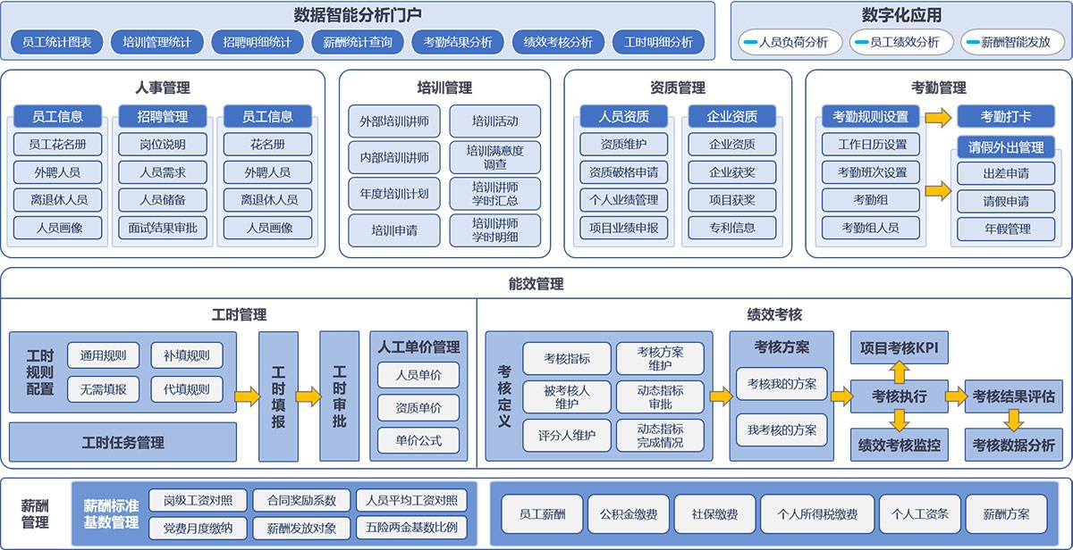 金慧人力资源作为整个企业信息化系统的重要组成部分,是其他业务系统的基础模块。系统包含了完善的HR日常功能,并内置许多丰富、美观的数据报表,有效提升了人力部门的信息采集和数据整理的工作效率。通过人力资源管理,可以解决以往人员信息混乱,难以了解—个人的全貌信息、各方面信息不—致,信息发生变化时很难统—更新等诸多问题。